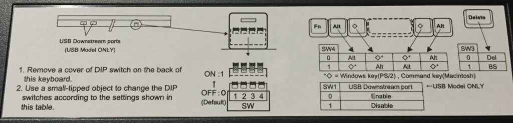 また、ハードウェアスイッチが付いていて、AltキーとWindowsキー(MacだとCommandキー)を入れ替えたり、DeleteキーとBSキーを切り替えたり出来ます。